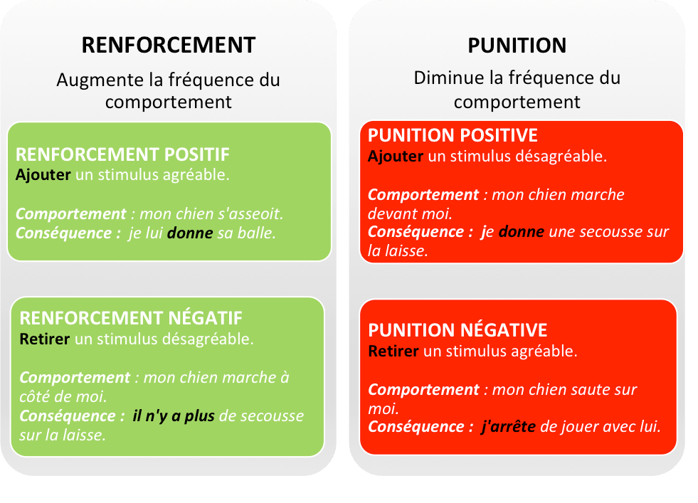 Avec le renforcement positif, il le fera volontiers car l’action lui a apporté quelque chose dans le passé, et même s’il n’a plus de récompense ensuite, il sera toujours amener à reproduire le comportement.
